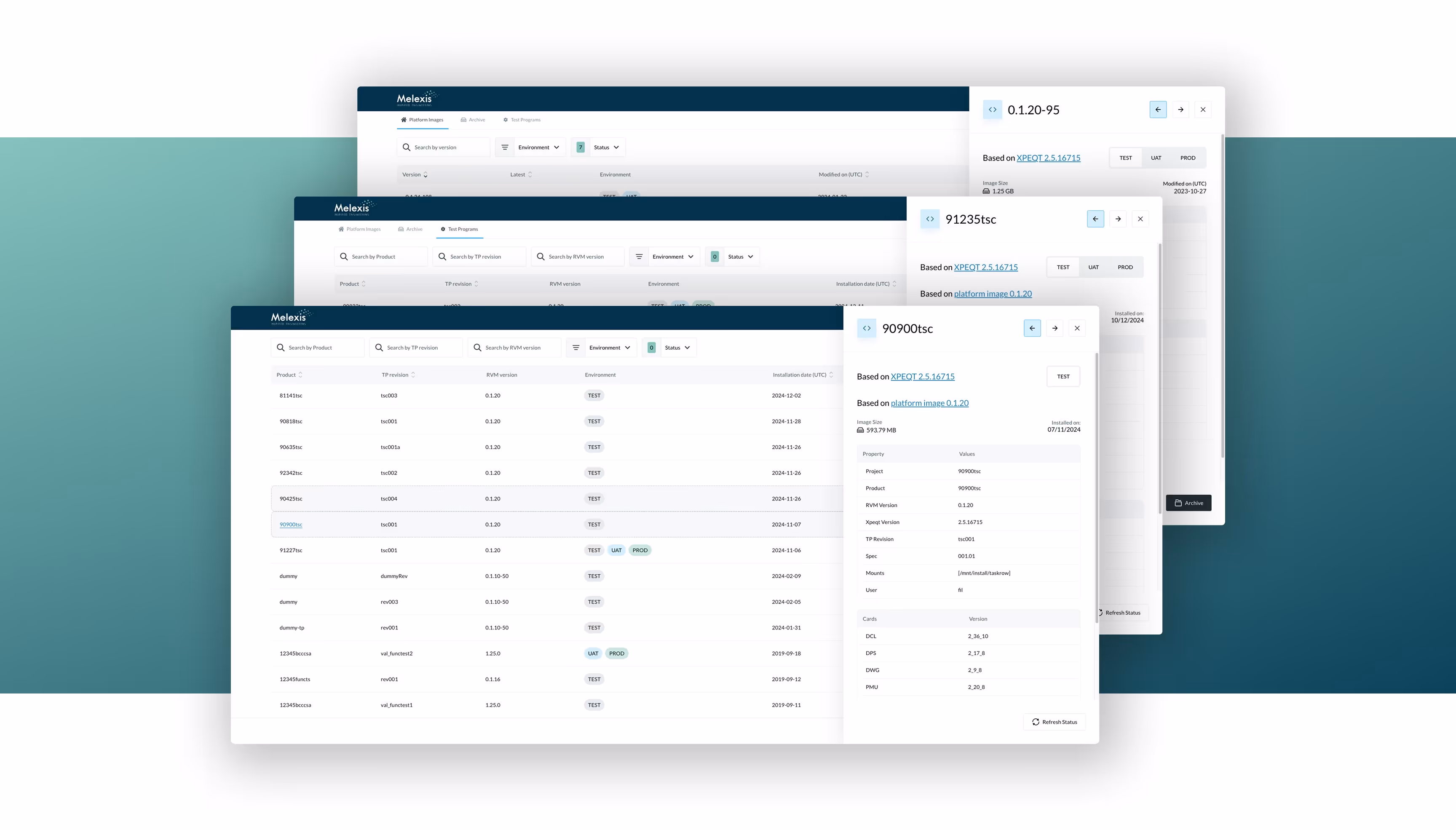 Previously, understanding a test program's construction required navigating through multiple services like GitLab pipelines, Artifactory UI, ERP, and TPP, with no single source providing complete information. Our web platform now consolidates all essential data, showing both availability (across sites and production readiness) and traceability (Docker layers and program-specific tooling). This consolidation not only saves time in information gathering but also enables easier comparison between test programs, with the recent addition of production readiness management capabilities. Several parameters can be reviewed, such as availability and reliability so errors in the underlying process can be solved faster.